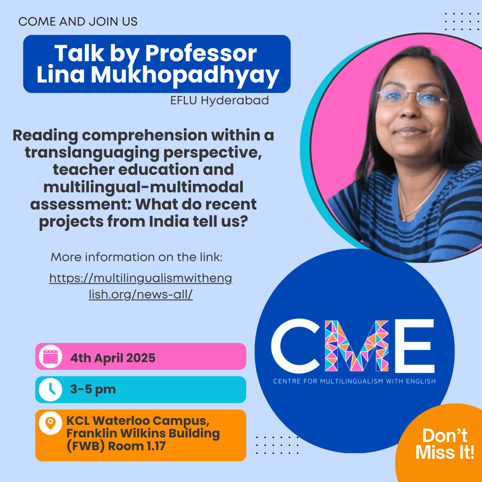 Reading comprehension within a translanguaging perspective, teacher education and multilingual-multimodal assessment: What do recent projects from India tell us? @KCL Waterloo Campus, Franklin Wilkins Building (FWB) Room 1.17 on 4th April, 3-5pm. A majority of multilingual (ML) children across the globe, especially from low SES families, do not enjoy the home language to language of instructionContinue reading “Talk by Professor Lina Mukhopadhyay”